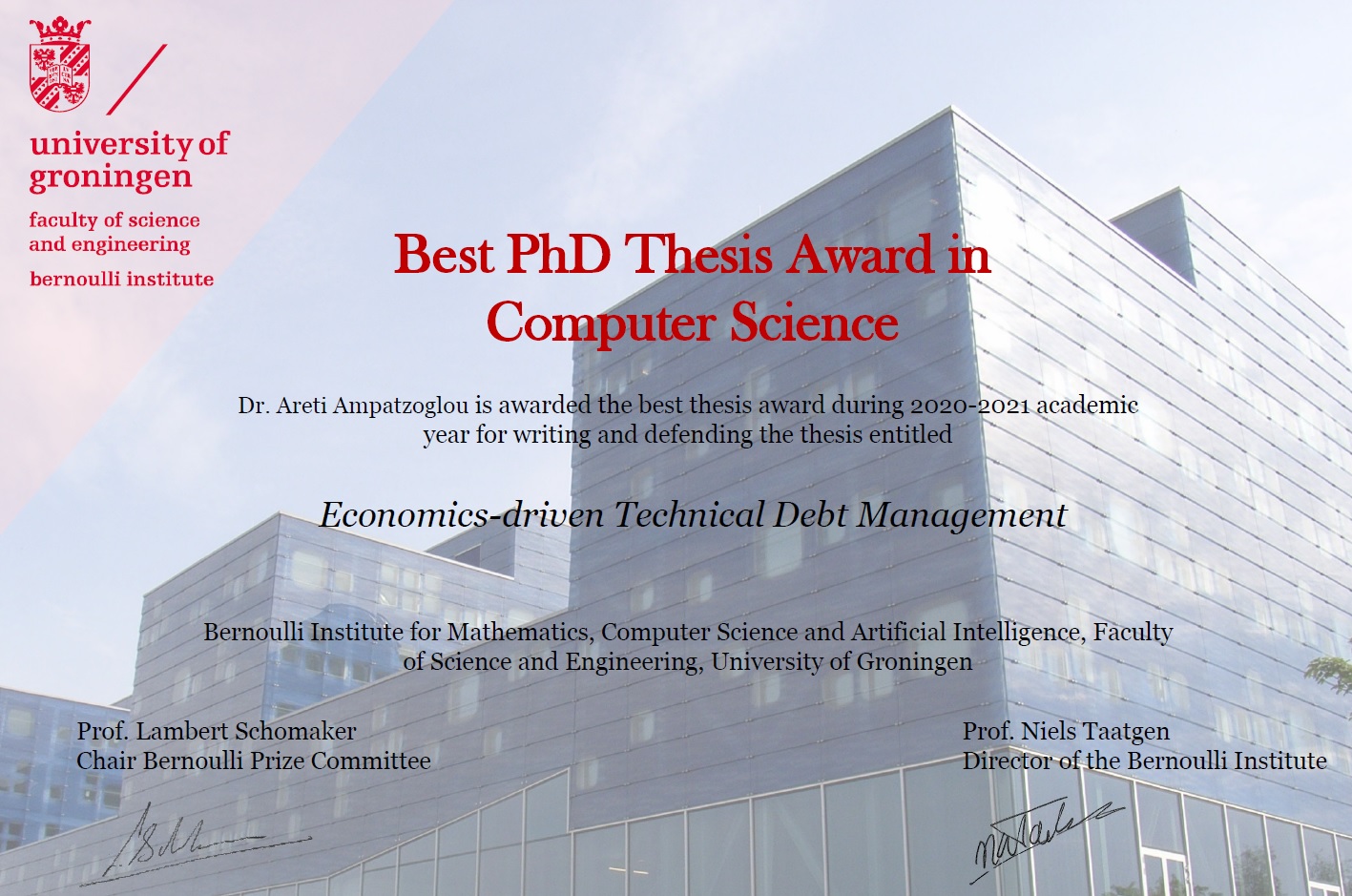 ![]() | Our former PhD student Dr. Areti Ampatzoglou was awarded with the Best PhD Thesis Award in Computer Science for the 2020-2021 academic year (University of Groningen) |